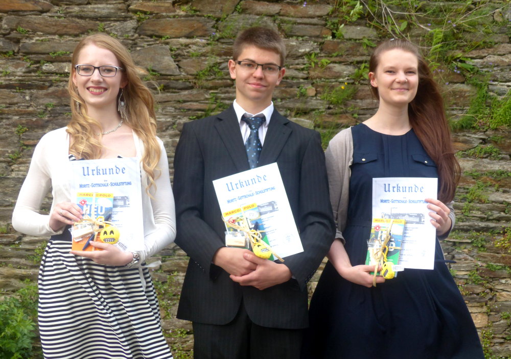 Schulstiftung vergibt wieder Stipendien für Sprachreisen Traditionell zur Eröffnung der Jahresausstellung im Roten Turm vergab auch dieses Jahr die "Moritz-Gottschalk-Schulstiftung" Stipendien an Schülerinnen und Schüler unseres Gymnasiums, die sehr gute schulische Leistungen erreicht haben und darüber hinaus auch ein sehr großes außerunterrichtliches Engagement zeigen. Am 16. Juni 2017 wurden durch den stellv. Treuhänder unserer Schulstiftung, Herr Thomas Weise, ausgezeichnet: Michelle Buschbeck, Marcel Rehwagen und Swantje Ficker. Herzlichen Glückwunsch. |