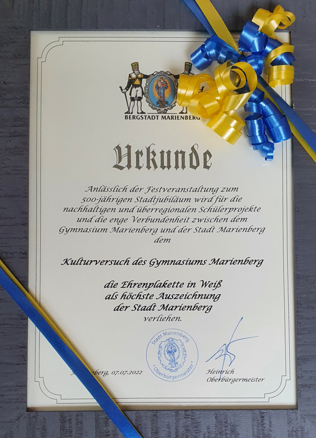 Unser Kulturversuch erhielt am 07.07.2022 die höchste Auszeichnung der Großen Kreisstadt Marienberg - die Ehrenplakette in Weiß. |